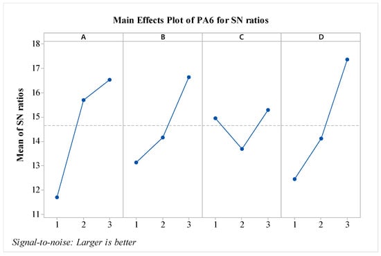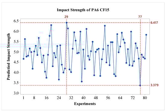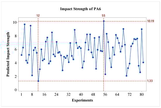 In the study, after obtaining the results, an analysis was conducted using the Taguchi method, which is one of the statistical experimental design methods widely used in engineering applications. In the literature, particularly in studies focused on impact strength, it has been stated that the Taguchi method is an effective approach [23]. Through the Taguchi analysis, the signal-to-noise (S/N) ratios for each experimental condition with different materials were calculated and graphed. The analysis was initially performed for the pure PA6 material. In the optimization of impact strength, the ‘Larger is Better’ technique was used. In terms of S/N ratios, the experiment with the highest S/N ratio is considered the most significant. In the experimental study, the S/N ratio is used as a quality parameter to evaluate the effect of input parameters on the responses [24]. The S/N ratios obtained from the experimental results for the PA6 materials are presented in Figure 3. As shown in the figure, for all factors except parameter C, the impact strength values increase as a factor level is raised. When considering the effects, it is observed that factors A and D are the most influential, while factor B is also effective, albeit to a lesser extent compared to A and D. Factor C shows a minimal effect on the results. Regarding the outer wall count, it is evident that it has a weak effect on the impact strength of PA6 materials. In this context, the literature indicates that a minimum layer thickness is desired for better bending strength, while a larger layer thickness is preferred for improved impact strength [24]. In this regard, the study is consistent with the literature on PA6 material. In terms of S/N ratios, the optimal parameters for PA6 material are identified as A3B3C2D3, which correspond to a nozzle temperature of 275 °C, a layer thickness of 0.45 mm, outer wall count of two, and a post-heat treatment duration of 160 min. For the worst-case scenario, it is observed that the A1B1C1D1 experiment corresponds to the lowest performance. Since a fractional factorial design method was used, 81 experiments were estimated using the Taguchi method’s prediction technique. The predicted results are shown in Figure 4. As seen in the figure, the difference between the highest and lowest values in the experimental design is 8.86 kJ/m2, indicating the effect of the factors and levels used in the experiment. The values for the best and worst cases are presented in Table 6.