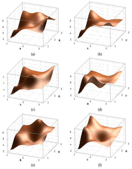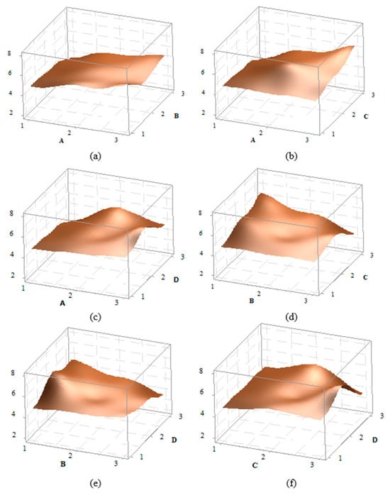 In the statistical experimental design, the 3D graphs of factor effects are crucial for interpreting results. For the impact strength of the PA6 material, 3D effect graphs for A–B, A–C, B–C, B–D, and C–D were created and are presented in Figure 5. Upon detailed examination of the graphs, it is observed that the peak point in the A–B effect graph occurs at the A3B2 level, while the peak in the A–C graph is at the A3C1 level, in the A–D graph at A3D3, in the B–C graph at B2C1, in the B–D graph at B2D3, and in the C–D graph at C1D3. For instance, in the A–B graph, it can be seen that as a parameter increases, the impact strength also increases. Additionally, in most graphs, an increase in the D parameter also leads to an increase in the impact strength. Overall, the graphs indicate that the effects of factors and their levels are significant.