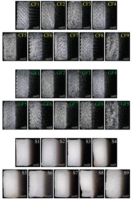 The fracture surfaces of samples are thoroughly examined using SEM for the damage analysis of composite products. In this context, various aspects such as the main matrix of the composite structure, fibers, fracture lines, fiber breakages, fiber structures, and matrix damages are analyzed in detail [27,28]. The macro damage images of the samples after impact are presented collectively in Figure 12. In the figure, view of fracture surface of 9 experiments of carbon fiber (CF)/glass fiber (GF) reinforced PA6 and pure PA6 (S) materials are given. When examining the fracture surfaces of the samples, it is observed that the pure PA6 samples exhibit a brittle fracture surface, while the fiber-reinforced samples show a more ductile and rougher surface.