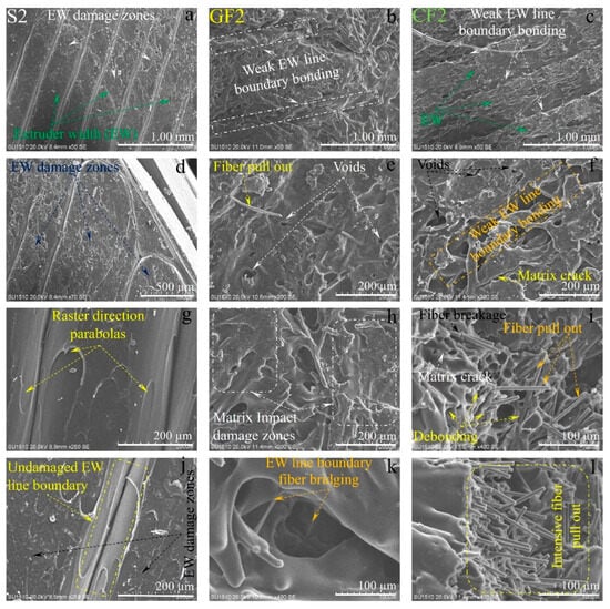 The SEM images of the damaged surfaces of the samples obtained from the impact tests are presented in detail and comparatively in Figure 13, Figure 14 and Figure 15 for micro damage analyses. Similarly, in a study conducted by Pen et al., an FDM study was carried out on carbon fiber-reinforced PA6 material. The study included SEM analysis of the fracture surface of samples, demonstrating interlayer bonding, porosity, and printing bead conditions as a function of nozzle and bed temperatures [29]. Upon examining Figure 13, it can be observed that the extruder widths (EWs) are evident in pure samples, especially at low nozzle temperatures. As the nozzle temperature increases, the formation of gaps between the EWs in pure samples is noteworthy (Figure 2a). It is believed that this may be due to contraction caused by rapid cooling during the printing of the first layer. In samples reinforced with glass and carbon fibers, although there are partially weak interfacial bonds between EWs at low temperatures (Figure 13b,c), it is observed that as the nozzle temperature increases, the fibers form bridging at the boundaries between the EWs (Figure 13k). During the production phase, it is believed that the flow of the liquid matrix facilitates the flow between the EWs, helping the structure to form more homogenously (Figure 15b,c). Upon examining the fracture surfaces, it is noted that in samples of pure PA6 in the 2nd experiment, impact damages occur at the overlap surfaces of the EWs, while damage-free regions are identified at the boundary areas due to geometry (Figure 13j).