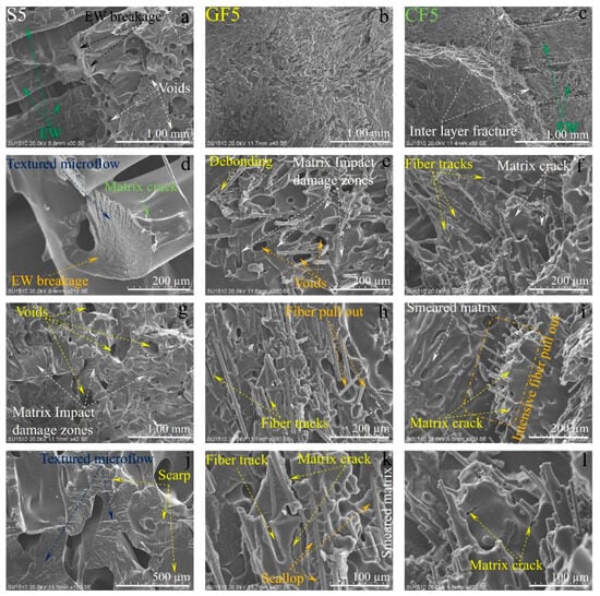 The SEM damage analysis of samples produced under fifth experimental conditions: (a,d,g,j) for pure PA6, (b,e,h,k) are for PA6/GF30, (c,f,i,l) for PA6 CF15 are different region and magnification).