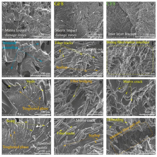 On the damaged surfaces of pure PA6 samples, damage such as textured microflow, toughened phase, and scarp have been particularly observed. It is believed that the changes in damage modes and fracture surface morphology are due to heat processing. In fiber-reinforced samples, particularly those reinforced with carbon fibers, a strong fiber-matrix interfacial bond has been observed. The smaller diameter and higher surface area of carbon fiber compared to glass fibers have contributed to the formation of a stronger fiber–matrix interfacial bond. In fiber-reinforced samples, toughness mechanisms such as debonding, pull-out, matrix cracks, and fiber bridging (Figure 13, Figure 14 and Figure 15) have had a positive effect on the impact toughness of the samples.