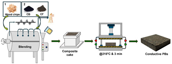 In the second stage, conductive carbon material was added to the wood chip-resin mixture at specified rates and mixed at 100 rpm for 120 s. The mixture was then transferred into a 20 cm by 20 cm mold, forming a composite cake. To obtain the final composite product, the composite cake was subjected to a curing process using a hot press (Burkle GmbH, Bad Bellingen, Germany) operating at 215 °C for a period of 180 s and a maximum of 80 bar for all boards. This curing step is crucial in hardening the composite material and improving its overall structural integrity and properties.