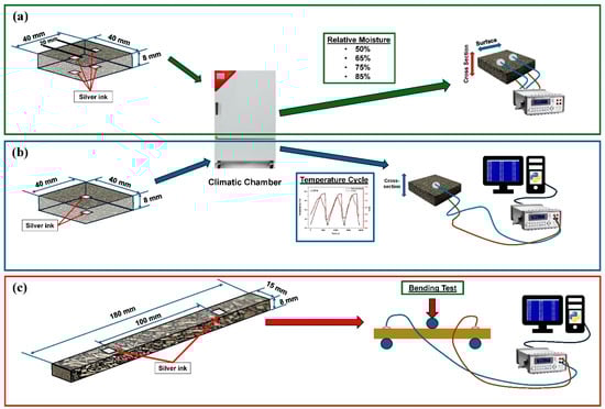 In this study, the effects of external factors such as temperature, moisture, and pressure as well as effects from material content on the electrical resistance were investigated (Figure 2). The electrical resistance change of the samples at different moisture levels was determined in a climatic chamber (Figure 2a). The samples were kept at 25 °C and at varied relative moisture, 65–75–85%, for 48 h, and the electrical resistance measurements were examined from surface and cross-section at the end of each 48 h.