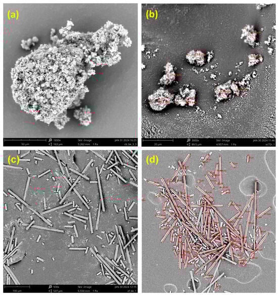 As presented by SEM images in Figure 3, the used CB particles tend to aggregate into several larger clusters. This results from the interaction between carbon particles under the influence of Van der Waals and electrostatic forces [37,38]. The CB particles possessed a rough surface and, consequently, a larger surface area [39], potentially facilitating the formation of stronger adhesion with the wood matrix [24]. The average size of the clusters was determined to be between 5 and 150 µm (Figure 3a,b).
