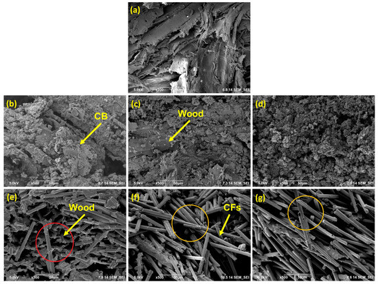 Figure 4e–g illustrates the irregular and, in contrast to CB, poor dispersion of CFs within the wooden matrix.