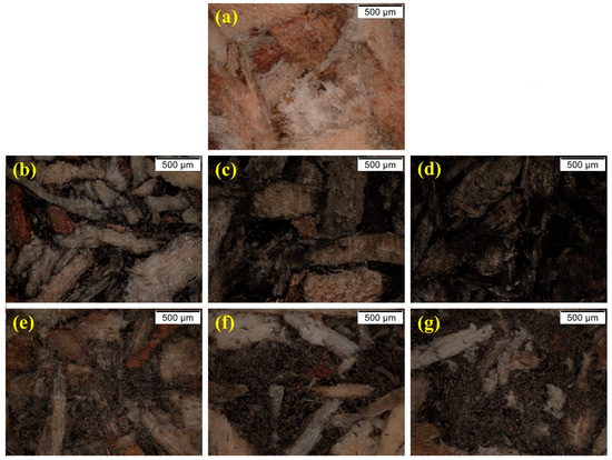 Optical microscopy images of (a) reference sample; (b) CB5; (c) CB10; (d) CB20; (e) CF20, (f) CF40 and (g) CF60.