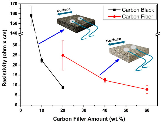 Figure 7 shows the electrical resistivity measurements taken from the surface and cross-sectional area. The measurements were made by taking ten measurements from the surface and cross-sectional areas of five different samples, and the mean and standard deviation of the values were calculated. It is expected, according to findings on fiberboards [20], that 2-dimensional conductive networks on the surface are observed at lower CF contents than a 3-dimensional conductive network.