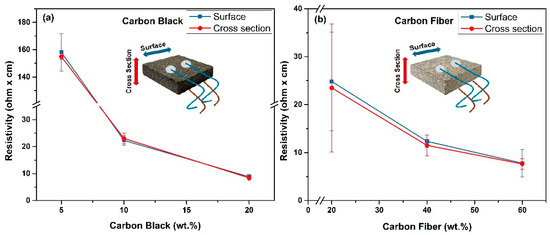 Surface and cross-section electrical resistivity measurement (a) CB samples and (b) CF samples.