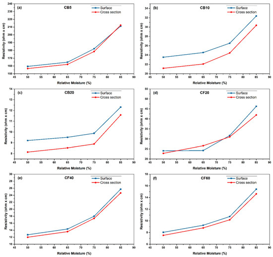 Moisture effect on electrical resistivity, (a) CB5; (b) CB10; (c) CB20; (d) CF20; (e) CF40 and (f) CF60.