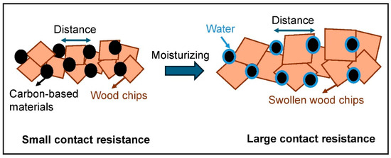This behavior can be attributed to water adsorption increasing the contact resistance of carbon-based materials, thereby reducing electrical conduction, as described by Zhang et al. for CB-filled cement-based materials [48]. According to this theory, the moisture-adsorbing wood particles effectively become a two-phase composite with higher resistivity due to the moisture and lower resistivity due to the filler. Consequently, higher moisture content results in more excellent contact resistance. Table 2 shows the resistance values of all samples before drying in the climate chamber, at different moisture conditions and after drying. When the swollen wood particles were dried, the resistance and thickness values of the composites decreased again, but not mainly to their original levels. This can again be explained using the theory of Zhang et al.: due to the moisture treatment, the distances between the carbon particles could possibly remain increased, even after a complete drying process [48]. This dependence on moisture can be in addition explained by a swelling behavior of the wood particles in high moisture conditions, described by Park et al. for CNT-filled agarose composites [49]. As the wood particles swell, the thickness of the composites increases, leading to a greater distance between the conductive fillers and a reduction in the number of filler junctions (Figure 9). This effect results in an increased resistance.