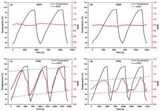 Measurements of the resistance change were monitored during the temperature change at a constant moisture. To test the sensor properties of the PBs, three consecutive heating–cooling cycles were performed. When the results were analyzed, only the sample CF40 (Figure 10c) showed reproducible values and a positive temperature coefficient (PTC). In contrast, in the case of the CB10 and CB20 (Figure 10a,b) samples, there was only a slight change in the resistance values, which remained almost constant. This constant behavior of the CB samples can be helpful to use these samples on the other hand specifically as a moisture or pressure sensor.