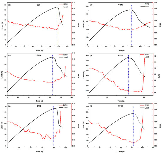 3-point bending test with time-dependent resistance change, (a) CB5; (b) CB10; (c) CB20; (d) CF20; (e) CF40; and (f) CF60.