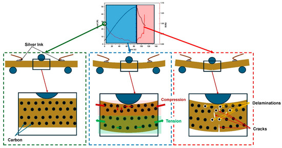 Pressure sensor properties or potential human movement detection of the samples were examined using a 3-point bending test, and the results are presented in Figure 11. The findings indicate that resistance values decrease in all samples as the loading increases. The blue line on the graph indicates the moment when the break in the PB begins. This point marks the transition where the material starts to crack, resulting in an increase in resistance as gaps form and expand within the composite structure. This behavior aligns with the literature, which describes the percolation network as being composed of both permanent and transient structures [63,64,65].