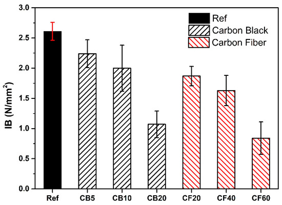 The mechanical properties of conductive PBs were evaluated using the EN 319 standard, which requires a minimum tensile strength of 0.40 N/mm2. The results shown in Figure 13 indicate that all PBs met this standard. However, the reference sample exhibited the highest tensile strength. A decline in mechanical properties was observed with the addition of carbon. This can be attributed to several factors. Firstly, carbon fillers tend to agglomerate within the matrix due to their inhomogeneous distribution, creating stress points that weaken the material [66]. Additionally, these fillers are less compatible with the adhesive compared to the wood chips, leading to poor interfacial interaction and adhesion. As the concentration of carbon-based fillers increases, the tensile strength further diminishes [20,21,67].