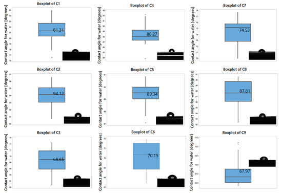 Figure 2 exhibits the boxplot of contact angle values obtained for our composites, and the images photographed during analysis performance. The values indicate, with the exception of C2 (with a contact angle of over 94°), the hydrophilic nature of the tested composites [69,70].