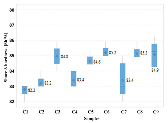 Boxplot showing Shore A hardness test results.