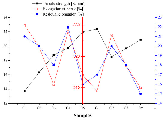 Values of mechanical properties determined for experimental samples (left, black axis shows tensile strength, N/mm2; middle, red axis shows elongation at break, %; and right, blue axis shows residual elongation, %).