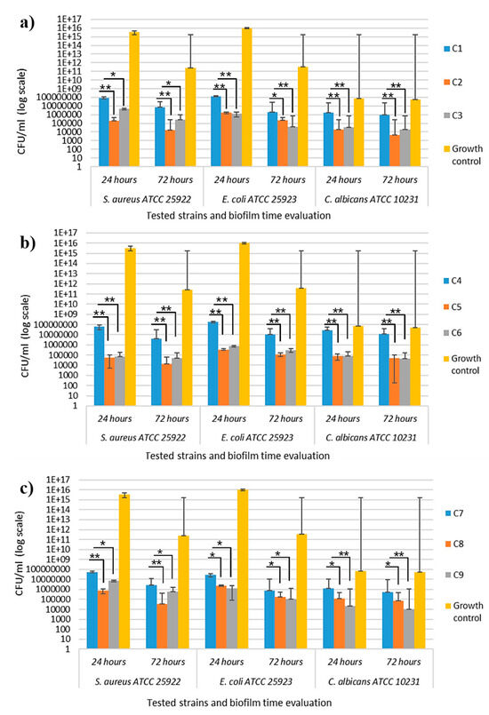 Quantitative assessment of the capacity of the selected strains to adhere and to generate mature biofilm on the surface of the tested polymeric samples was performed using the viable cell count (VCC) method. Overnight microbial cultures were diluted in fresh nutrient broth media at 1.5 × 105 CFU/mL final density and 2 mL of the obtained suspension were seeded in 24 multi-well plates containing the treated materials, previously sterilized by UV irradiation (exposure time 30 min/each part). The plates were incubated at 37 °C, 24 h (for adherence evaluation), and 72 h (for biofilm evaluation). Subsequently, the polymeric samples were gently washed with sterile phosphate-buffered saline (PBS) in order to remove the non-adherent bacteria and placed in 14 mL centrifuge tubes containing 1 mL of sterile PBS. The samples were vigorously mixed by vortexing for 1 min and sonicated for 10 s. Serial dilutions obtained from each sample were inoculated on Muller Hinton agar and Sabouraud agar plates in triplicates, and viable cell counts (VCCs) were assessed after incubation at 37 °C for 24 h. Each test was performed in triplicate and repeated on at least three separate occasions.