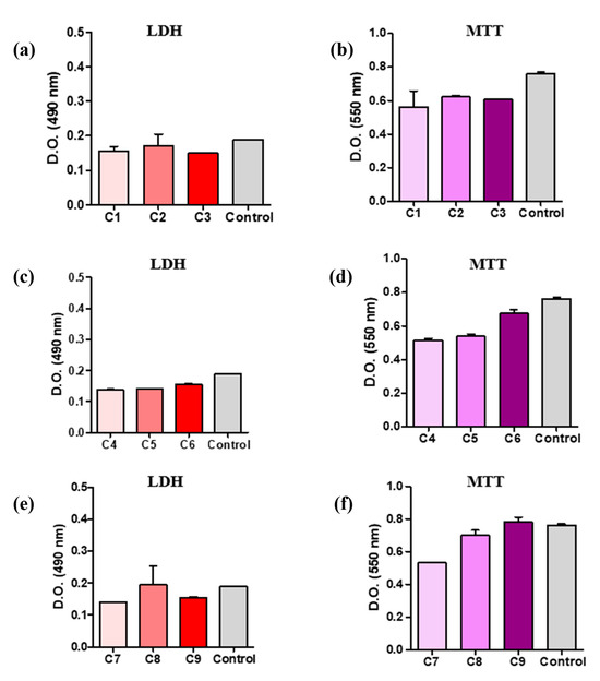 Biological results were analyzed using a one-way ANOVA repeated measures test. All statistical analyses were performed using GraphPad Prism Software, v. 5.03 428 (GraphPad Software, La Jolla, CA, USA, www.graphpad.com, accessed on 20 May 2020). p-values were determined via two-way ANOVA and Dunnett’s multiple comparisons tests. Significance difference was noted as * for p < 0.05, and ** for p < 0.01.