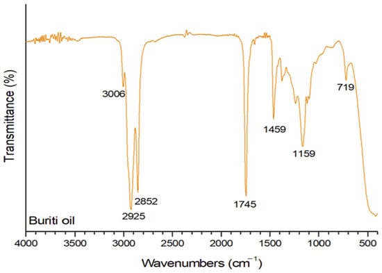 The bands at 1459 cm−1 and 719 cm−1 correspond to C–H2 scissoring and asymmetric C–H3 stretching, respectively. These bands further elucidate the molecular structure of buriti oil, providing insights into the specific vibrations associated with its aliphatic hydrocarbons [34,35]. The band at 3006 cm−1 is attributed to C–H stretching related to =C–H bonding. The observed spectral features align with the expected characteristics of long-chain fatty acids found in buriti oil. The presence of ester functions, unsaturation, and specific vibrational modes corroborates the typical composition of vegetable oils. The spectral similarities with oleic and palmitic acids further validate the fatty acid composition of buriti oil. Detailed analyses reveal specific vibrations related to the molecular structure of buriti oil. Bands associated with C=C–C–O stretching and C–C movement provide insights into the molecular arrangement and potential similarities with triglycerides such as triolein [34,36].