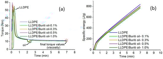 Torque (a) and specific energy (b) curves as a function of processing time for the LLDPE and compositions.