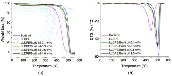 Thermogravimetric analysis (a) and differential thermal gravimetry (b) of buriti oil, pure LLDPE, and LLDPE/buriti oil compositions.