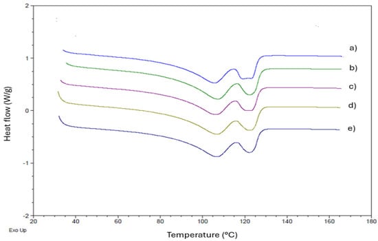 DSC analysis of LLDPE and its compositions with buriti oil: (a) LLDPE, (b) LLDPE/buriti oil—0.1%, (c) LLDPE/buriti oil—0.3%, (d) LLDPE/buriti oil—0.5%, (e) LLDPE/buriti oil—1.0%. Note: Crystalline melting temperature (Tm).