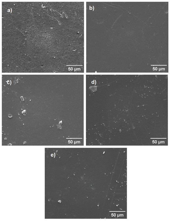 The morphological characteristics of pure LLDPE and the LLDPE/buriti oil systems were analyzed by SEM, as presented in Figure 6. The micrograph of pure LLDPE is shown in Figure 6a. A surface characterized by high roughness was noted, a morphological characteristic of the polymer that is also highly influenced by the methodology used in the preparation of the specimens. The morphologies identified in Figure 6b refer to the systems containing buriti oil. These micrographs showed smoother and more-homogeneous surfaces regardless of the oil content added. Therefore, it was observed that the buriti oil used as a plasticizer during processing helped in the processing and contributed to obtaining smoother and more-homogeneous surfaces compared to the pure polymer.