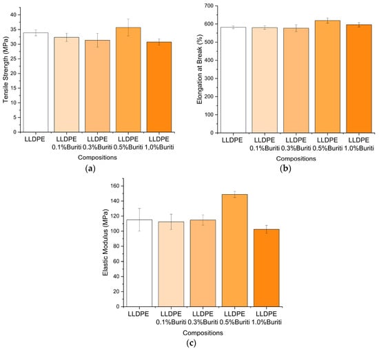 The mechanical properties, including the tensile modulus of elasticity, tensile strength, and elongation at break, were evaluated in accordance with ASTM D638 standards [61]. The results of the tensile test for LLDPE with increasing concentrations of buriti oil (0.1%, 0.3%, 0.5%, and 1%) are presented in Figure 7. The values represent the average of the obtained results with their respective standard deviations.