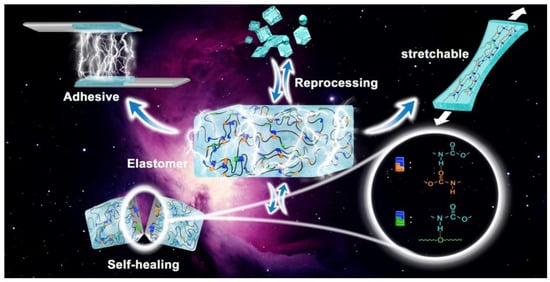 - Xu, H.; Tu, J.; Li, H.Z.; Ji, J.; Liang, L.; Tian, J.Q.; Guo, X.D. Room-temperature self-healing, high ductility, recyclable polyurethane elastomer fabricated via asymmetric dynamic hard segments strategy combined with self-cleaning function application. Chem. Eng. J. 2023, 454, 140101. [Google Scholar] [CrossRef]