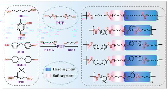 Polytetramethylene ether glycol (PTMG, ≥99%, Mn = 1000 g/mol) was purchased from BASF Chemicals Co., Ltd., Shanghai, China. Hexamethylene diisocyanate (HDI, ≥99.5%), 4,4′-dicyclohexylmethane diisocyanate (HMDI, ≥99.5%), and 4,4′-methylene diphenyl diisocyanate (MDI, ≥99.6%) were purchased from Wanhua Chemical Group Co., Ltd., Yantai, China. Isophorone diisocyanate (IPDI, 99%), tolylene-2,4-diisocyanate (TDI, 95%), and dibutyltin dilaurate (DBTDL, 95%) were acquired from Shanghai Aladdin Biochemical Technology Co., Ltd., Shanghai, China. 1,4-butanediol (BDO, ≥99%) was purchased from Sinopharm Group Chemical Reagent Co., Ltd., Shanghai, China.