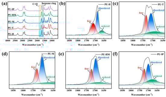 (a) FTIR full spectrum of PUs. (b) FTIR spectra in the C=O region of PU-H. (c) FTIR spectra in the C=O region of PU-T. (d) FTIR spectra in the C=O region of PU-M. (e) FTIR spectra in the C=O region of PU-HM. (f) FTIR spectra in the C=O region of PU-IP.