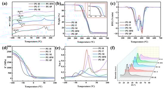(a) DSC curves of PUs. (b) TGA curves of PUs. (c) DTG curves of PUs. (d) DMA curves of PUs. (e) Tan δ curves of PUs. (f) XRD patterns of PUs.