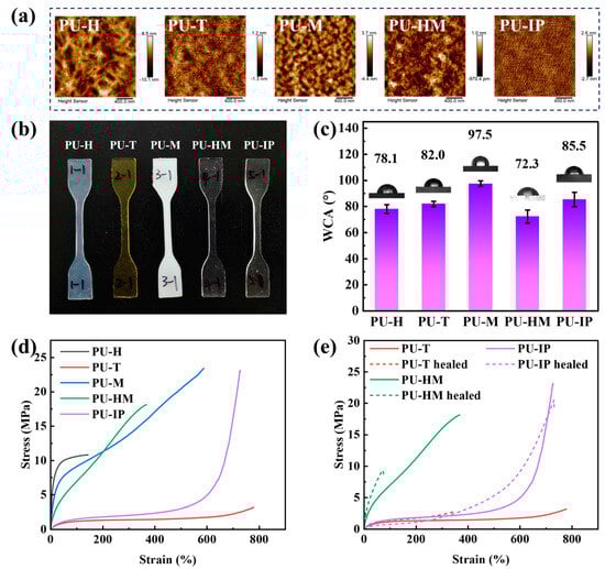 (a) AFM images of PUs. (b) Optical photo of dumbbell PU samples. (c) Water contact angles (WCA) of PUs. (d) Strain–stress curves of PUs. (e) Strain–stress curves of PU-T, PU-HM, and PU-IP after healing.