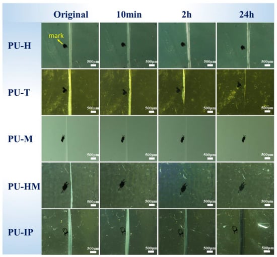 Optical microscopy photos of the scratch-healing process for the PUs.