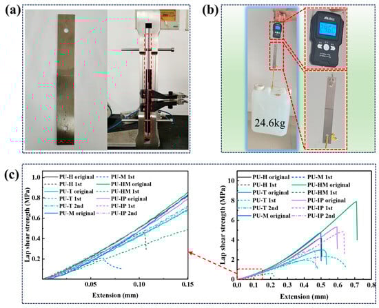 (a) Photos of the bonded steel plates and lap shear test. (b) The photo of the steel plates after PU-HM bonding lifting a 24.6 kg weight. (c) The initial and healed (80 °C × 24 h) lap shear test curves and enlarged images of the PUs.