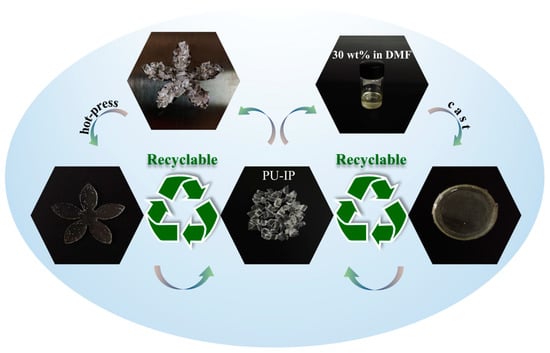 Schematic diagram of PU recycling and reprocessing via solution casting and hot pressing.