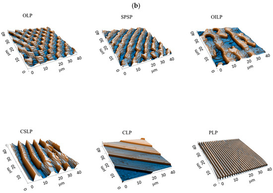 When compared to the previously reported textured implant surfaces (Sa = 8.24 μm; Sz = 40 μm), the values for all of the topographically modified surface areas were characterised by a decreased roughness (Sa below 5 μm), with the exception of the CLP that had an Sa = 10.77 μm. As shown by the AFM and SEM images (Figure 1a,b), the textured surfaces were characterised by a step-like type profile, containing microscale features as well as depth step features of 250 nm, culminating in a maximum depth of 1 μm for all the samples, while the lateral step features length and width varied according to Table 1. Moreover, as the analysed surfaces mainly revealed peaks with flat profiles as well as valleys, the calculated skewness (Sku) and kurtosis (Ku) showed positive values, indicating an excess in skewness and kurtosis for all the samples except OLP, for which a negative skewness characteristic to a valley-predominant profile was obtained (Table 1). This indicates, that in general, the mean and median were greater than the mode, and that the OLP surface presented more valleys than peaks. When compared to the analysed smooth silicone implant surface, the values followed the trend for positive skewness and excess kurtosis values (Ssk: 0.027and SKU: 1.833).
