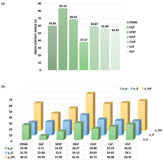 (a) Modifications in surface wettability evaluated by contact angle measurements of PDMS surfaces; (b) Surface free energy components.