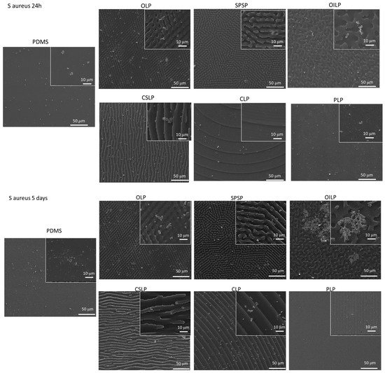 This aspect can be explained through the capacity of the textured PDMS surfaces to generate air-water interfacial regions that were previously inaccessible for the bacterial attachment of S. aureus. This illustrates the potential of the proposed microstructures to influence the initial stages of bacterial attachment transiently. In addition to chemical sensing, bacteria cells are also capable of sensing surface-associated mechanical cues [35]. The reason is that when the microscale features of the surface are in the same order as bacteria, their initial attachment is influenced by cell membrane deformation and physico-chemical forces [35]. When the interrupted and/or mixed linear features surfaces were analysed, our results were corroborated by those of Linklater et al. [36] on linearly increasing heights surface geometries in black silicon, where it was demonstrated that the greatest bactericidal effects against S. aureus bacteria were exhibited by the smaller, densely packed pillars. Moreover, the observation on the engineered gradient linear pattern surfaces (CLP), characterised by well-defined step feature dimensions of at least five orders of magnitude larger than a single bacterium, demonstrated an enhanced bacterial attachment based on the highest provided available contact area, and therefore, the ability to shelter S. aureus, which is in accordance with the effects described by Helbig et al. [37]. It is noteworthy that bacterial attachment was markedly enhanced on the smooth substrate over time, whereas the protruding surface features impeded further biofilm development. There are studies underlining the role of surfaces with a feature smaller than a single microorganism in reducing bacterial adhesion [37,38,39,40,41], including biomimetic topographies (i.e., lotuses [42], cicadae [43], sharks [34], geckos [44,45], and dragonfly wings [46]), which are however linked to contaminant-free surfaces and superhydrophobic physical surface structures (combined with specific compounds onto their surfaces).