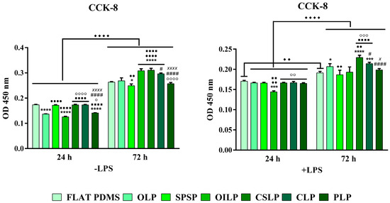 The viability/proliferation rate assessed by the CCK-8 assay after 1 and 3 days, under both standard (-LPS) and pro-inflammatory (+LPS) conditions (n = 3, mean ± SD, **** p < 0.0001, *** p < 0.001, * p < 0.05 vs. FLAT PDMS; ●●●● p < 0.0001, ●● p < 0.01 vs. OLP; ■■■■ p < 0.0001, ■■ p < 0.01 vs. SPSP; ○○○○ p < 0.0001, ○○○ p < 0.001, ○○ p < 0.01, ○ p < 0.05 vs. OILP; #### p < 0.0001, # p < 0.05 vs. CSLP; xxxx p < 0.0001, x p < 0.05 vs. CLP). The significance level between the two groups (24 h vs. 72 h) was ♦♦♦♦ p < 0.0001 (-LPS) and ♦♦♦♦ p < 0.0001, ♦♦ p < 0.01 (+LPS).
