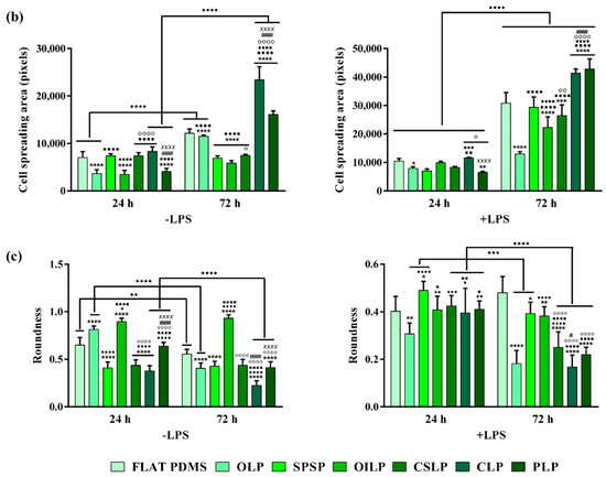 (a) The morphological features exhibited by the RAW 264.7 macrophages on the analysed PDMS surfaces after 1 and 3 days of culture, under standard (-LPS) and pro-inflammatory (+LPS) conditions (green fluorescence—actin cytoskeleton). Scale bar represents 50 µm; (b) Cell spreading area quantification (n = 30 cells, means ± SD; **** p < 0.0001, *** p < 0.001, ** p < 0.01, * p < 0.05 vs. FLAT PDMS; ●●●● p < 0.0001, ●● p < 0.01 vs. OLP; ■■■■ p < 0.0001, ■■■ p < 0.001 vs. SPSP; ○○○○ p < 0.0001, ○○ p < 0.01, ○ p < 0.05 vs. OILP; #### p < 0.0001 vs. CSLP; xxxx p < 0.0001 vs. CLP). The significance level between the two groups (24 h vs. 72 h) was ♦♦♦♦ p < 0.0001; (c) Cell roundness quantification (n = 30 cells, means ± SD; **** p < 0.0001, ** p < 0.01, * p < 0.05 vs. FLAT PDMS; ●●●● p < 0.0001, ●●● p < 0.001, ●● p < 0.01, ● p < 0.05 vs. OLP; ■■■■ p < 0.0001, ■■ p < 0.01, ■ p < 0.05 vs. SPSP; ○○○○ p < 0.0001 vs. OILP; #### p < 0.0001, # p < 0.05 vs. CSLP; xxxx p < 0.0001 vs. CLP). The significance level between the two groups (24 h vs. 72 h) was ♦♦♦♦ p < 0.0001, ♦♦ p < 0.01 (-LPS) and ♦♦♦♦ p < 0.0001, ♦♦♦ p < 0.001 (+LPS).