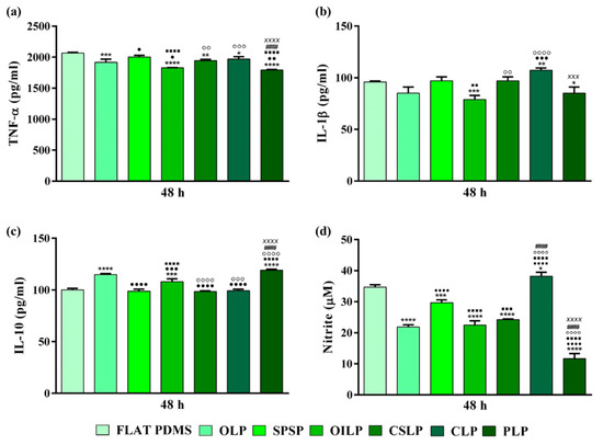 Quantification of the inflammatory mediators released after 2 days of culture (100 ng mL−1). ELISA measurement of: (a) TNF-α (**** p < 0.0001, *** p < 0.001, ** p < 0.01, * p < 0.05 vs. FLAT PDMS; •••• p < 0.0001, •• p < 0.01, • p < 0.05 vs. OLP; ■■■■ p < 0.0001 vs. SPSP; ○○○ p < 0.001, ○○ p < 0.01 vs. OILP; #### p < 0.0001 vs. CSLP, xxxx p < 0.001 vs. CLP); (b) IL-1β (*** p < 0.001, ** p < 0.01, * p < 0.05 vs. FLAT PDMS; ••• p < 0.001 vs. OLP; ■■ p < 0.01 vs. SPSP; ○○○ p < 0.001, ○○ p < 0.01 vs. OILP; xxx p < 0.001 vs. CLP); (c) IL-10 (**** p < 0.0001, *** p < 0.001 vs. FLAT PDMS; •••• p < 0.0001, ••• p < 0.001 vs. OLP; ■■■■ p < 0.0001 vs. SPSP; ○○○○ p < 0.0001, ○○○ p < 0.001 vs. OILP; #### p < 0.0001 vs. CSLP; xxxx p < 0.0001 vs. CLP); (d) Extracellular NO measurement by the Griess reagent (**** p < 0.0001, *** p < 0.001, * p < 0.05 vs. FLAT PDMS; •••• p < 0.0001 vs. OLP; ■■■■ p < 0.0001, ■■■ p < 0.001 vs. SPSP; ○○○○ p < 0.0001 vs. OILP; #### p < 0.0001 vs. CSLP, xxxx p < 0.0001 vs. CLP). Results are expressed as means ± SD (n = 3).