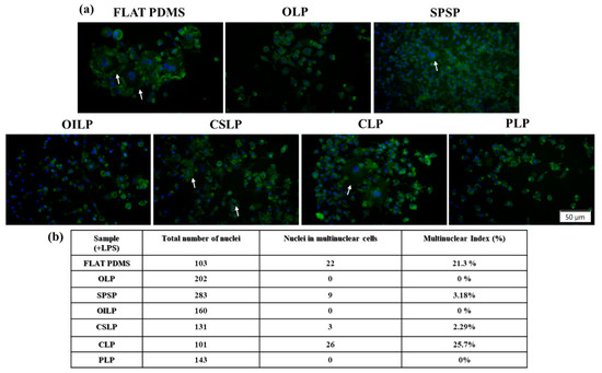 As seen from Figure 7a, the macrophages grown onto the flat PDMS displayed morphological features specific to multinucleated giant cells, adopting enlarged bodies with numerous filopodial extensions and multiple nuclei (white arrows), whereas on the microtopographically altered PDMS surfaces, the formed FBGCs were smaller and presented a lower number of nuclei (three or four nuclei per cell). Furthermore, even though the cells grown on the OILP, OLP, and PNP surfaces exhibited a morphology specific to the LPS-stimulated cells, no multinucleated giant cells were found, an observation which may suggest that these microtopographies are capable of hindering the macrophage fusion process. Moreover, this hypothesis is also supported by the secretion levels of the analysed inflammatory mediators, where in the case of the aforementioned substrates, an anti-inflammatory trend was noticed. In addition, with the exception of the CLP support (25.7%), the cells cultured onto the rest of the tested microtextured surfaces showed a significant reduction in the multinucleated FBGCs formation incidence (Figure 7b), indicating that in a pro-inflammatory environment, surface microtexturing could dampen macrophage fusion in comparison to smoother surfaces.