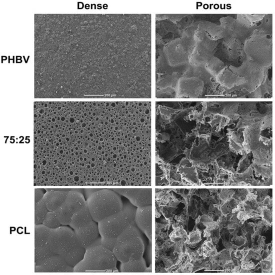 Scanning electron microscopy images of the upper surface of the studied materials [PHBV: poly(hydroxybutyrate-co-hydroxyvalerate; PCL: poly(ε-caprolactone); the 75/25 blend]. Scale bar = 200 µm.