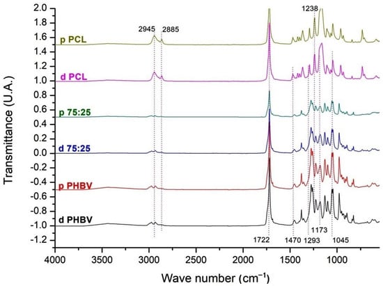 FTIR spectra of dense and porous PHBV, 75/25 blend, and PCL in the range of 4000 to 500 cm−1. d PHBV = dense PHBV (G2); p PHBV = porous PHBV (G3); d 75:25 = dense 75/25 blend (G4); p 75:25 = porous 75/25 blend (G5); d PCL = dense PCL (G6); p PCL = porous PCL (G7).