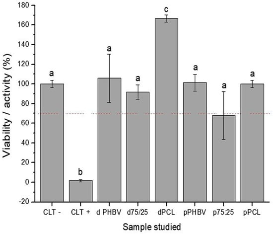 MTT assay results of mesenchymal stem cells after 24 h of incubation. Different lowercase letters indicate significant differences between groups (p < 0.05). CLT − = Negative Control; CLT + = Positive Control; d PHBV = dense PHBV (G2); p PHBV = porous PHBV (G3); d 75:25 = dense 75/25 blend (G4); p 75:25 = porous 75/25 blend (G5); d PCL = dense PCL (G6); p PCL = porous PCL (G7). The dashed line indicates a 30% reduction in viability of the negative control.