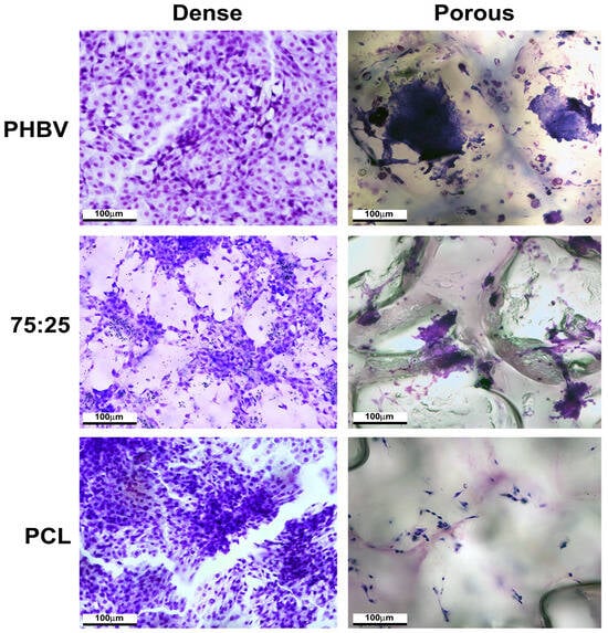 - Modolo, L.P.; Franca, W.R.; Simbara, M.M.O.; Malmonge, S.M.; Santos, A.R., Jr. Dense, porous, and fibrous scaffolds composed of PHBV, PCL, and their 75:25 blend: An morphological and cytochemical characterization. Int. J. Polym. Anal. Charact. 2023, 28, 73–87. [Google Scholar] [CrossRef]
