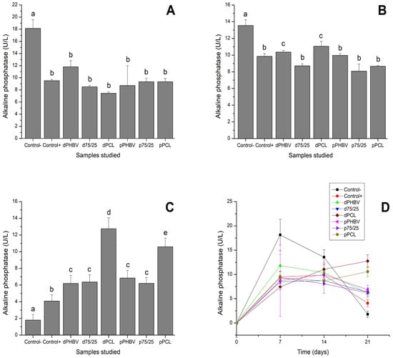 Production of alkaline phosphatase during osteogenic differentiation. (A) 7 days; (B) 14 days; (C) 21 days; (D) over time. Different lowercase letters indicate statistically significant differences (one-way ANOVA and Tukey’s post-test, p < 0.05). CLT − = Negative Control; CLT + = Positive Control; d PHBV = dense PHBV (G2); p PHBV = porous PHBV (G3); d 75:25 = dense 75/25 blend (G4); p 75:25 = porous 75/25 blend (G5); d PCL = dense PCL (G6); p PCL = porous PCL (G7).